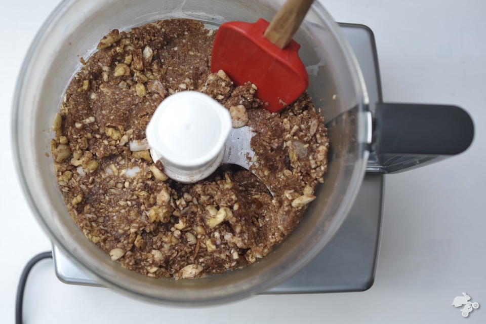 Giet de gewelde amandelen af en doe ze in de foodprocessor, samen met de walnoten, ontpitte dadels, cacao en kokosolie. Maal alles fijn, maar niet overdreven; het moet een samenhangend geheel worden, maar hier en daar nog een klein stukje is geen probleem.