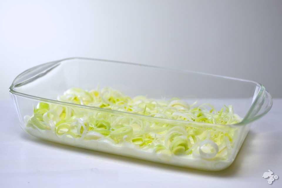 - snij het donkergroene gedeelte van de prei (was het zand eruit) en spreid de stukken prei uit over een bakplaat.
