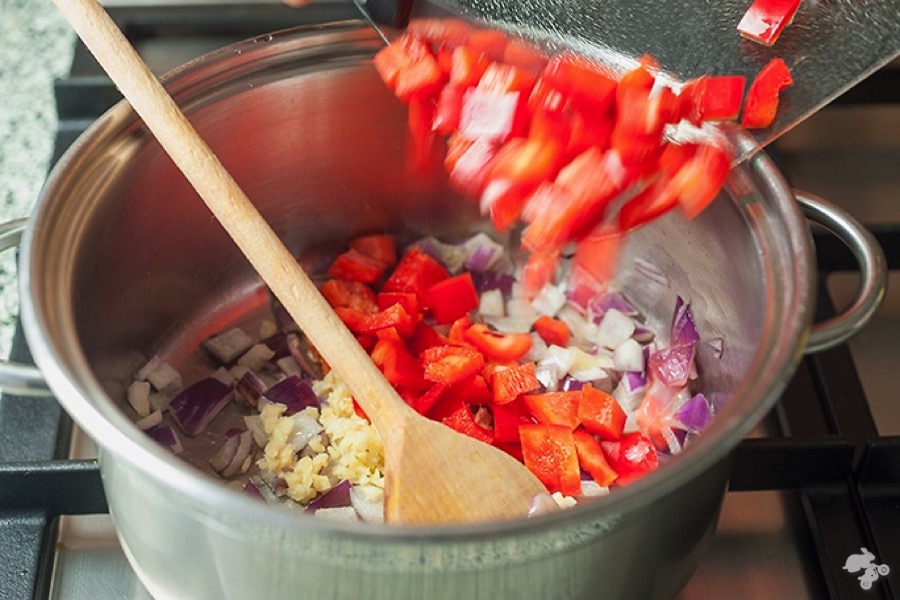 Terwijl de tomatensaus pruttelt, werk je aan de losse ‘onderdelen’. Kook of stoom verschillende groenten, rasp de wortel, bak de courgette, enzovoort. En natuurlijk de pasta beetgaar koken.
