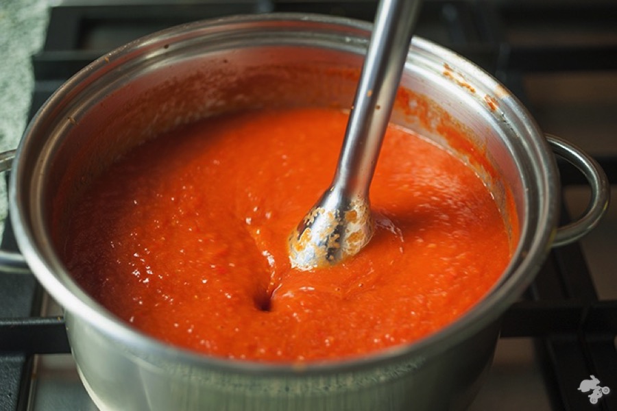 Snij de ui in ringen en bak een paar minuten in olijfolie op middelhoog vuur. Snij de bleekselderij in dunne reepjes, rasp de wortel en plet de knoflook. Alles bij de uien in de pan doen en even omscheppen. Dan de tomatenpuree en de tomaten erbij. Breng alles aan de kook en laat 20 minuten op een laag pitje sudderen en indikken. Pureer met een staafmixer tot een gladde saus.