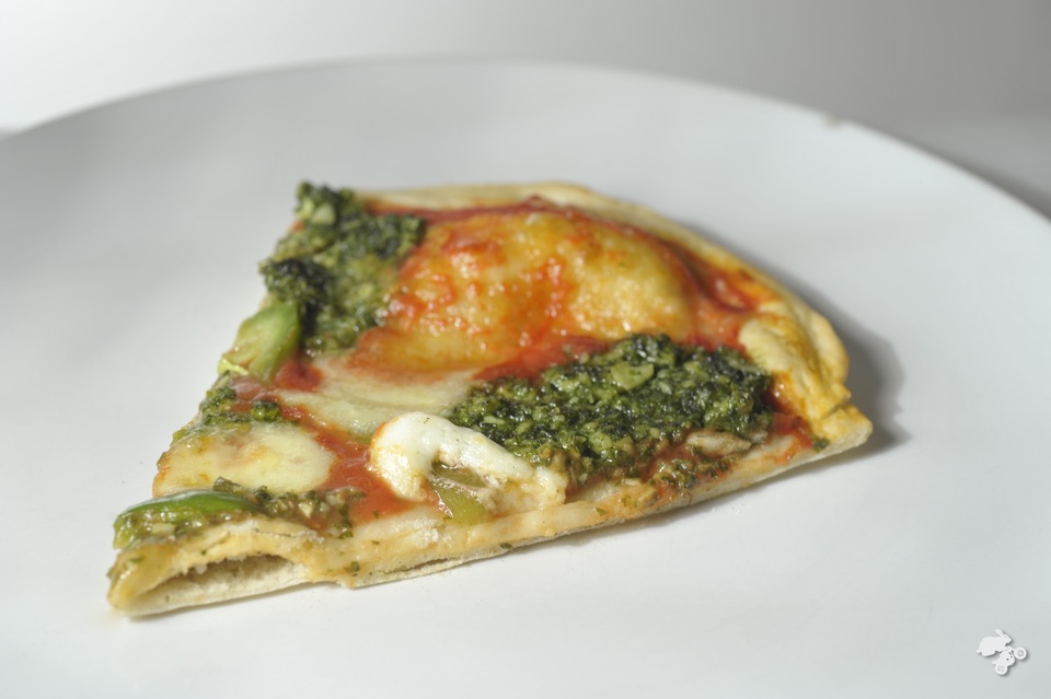 5. Met een lepel een paar flinke dotten boerenkoolpesto over de pizza verdelen.