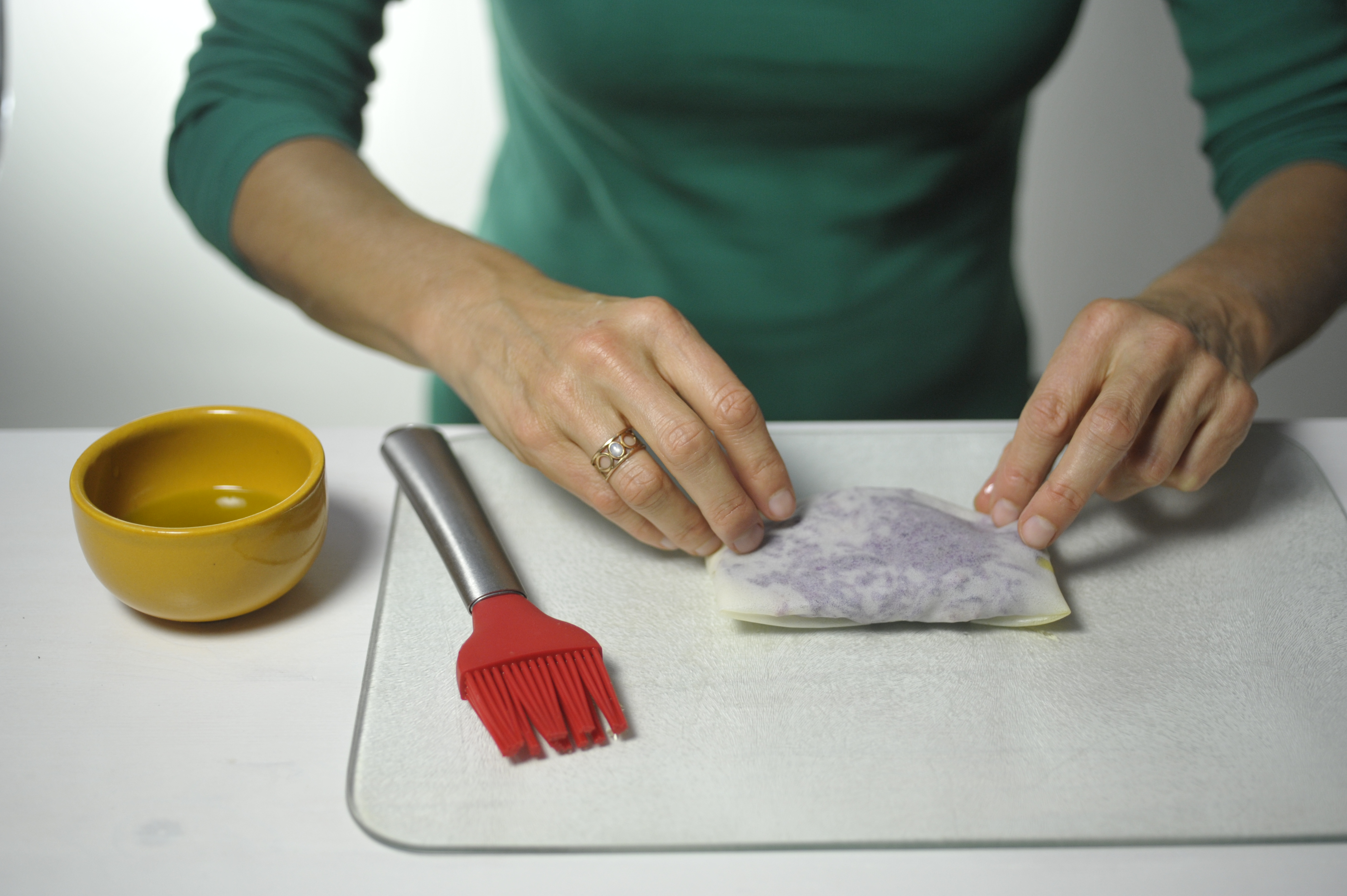Neem een vel filodeeg en leg daar met behulp van twee lepels een bergje van het rodekool-mengsel op. Maak een pakketje van het filodeeg, door het deeg eerst horizontaal en dan verticaal naar binnen te vouwen (zie filmpje en foto’s). Bestrijk de Poolse loempia’s aan beide kanten met olie en leg op een met bakpapier beklede bakplaat. Maak op deze manier 15 pakketjes.
